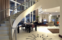 The interior of the apartment is a work of art offering extraordinary room proportions, high ceiling and spectacular views through the long glass window walls. The décor of the residence is fascinating. The rooms look cool and cozy. The shades are not dull rather bright, elegant and chic.